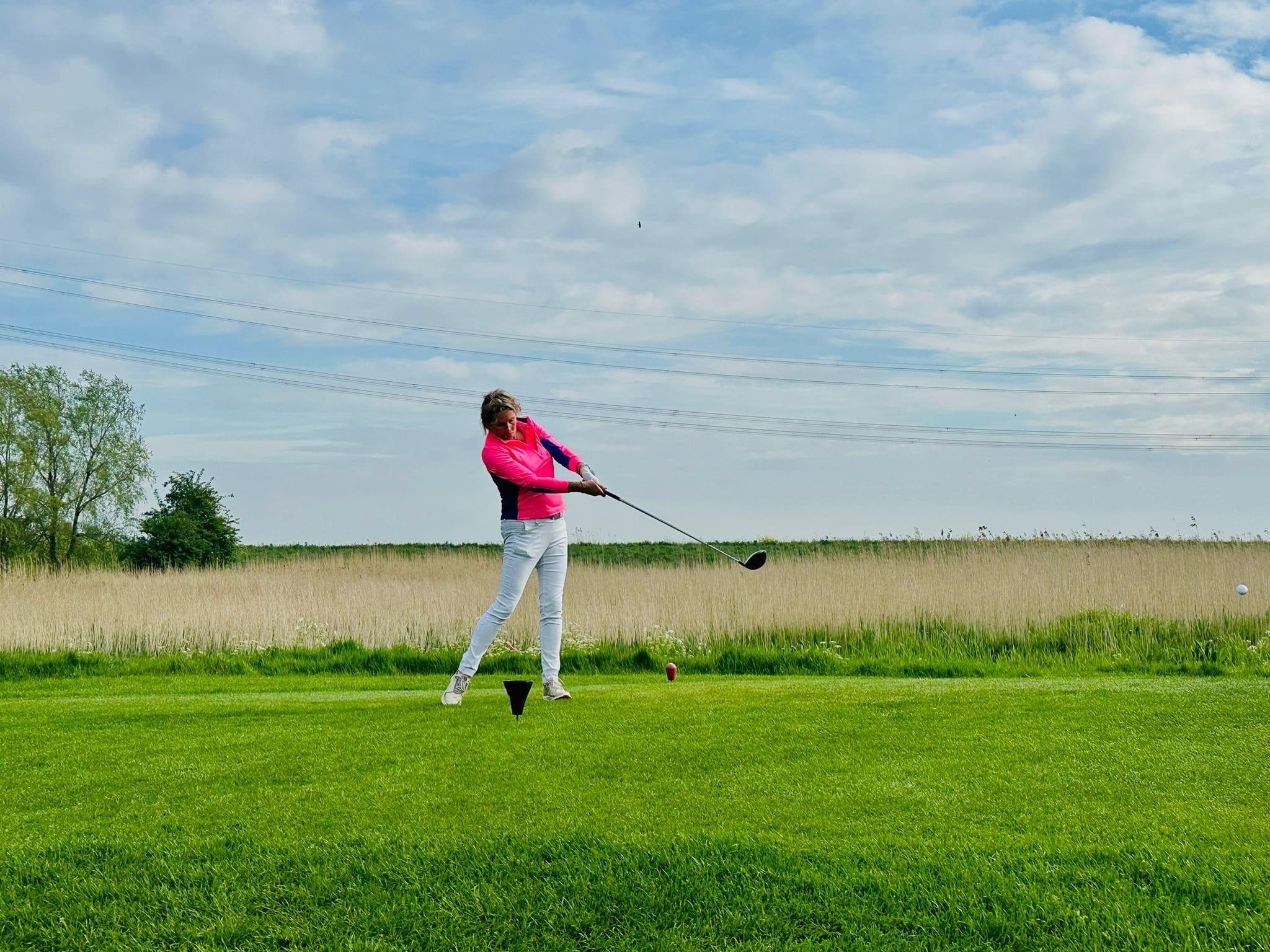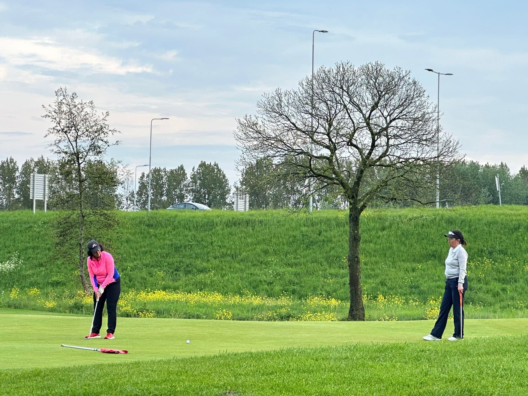 Na de lunch de single matchplay. Op de buienradar hadden we onweer en regen zien aankomen, alleen wanneer deze zou overkomen was niet duidelijk. Rond 17 uur begon het te rommelen en al snel daarna begon de regen. Niet normaal dat er in zo’n korte tijd zoveel kan vallen. De wedstrijden werden dan ook met 1 uur stopgezet. Na een uurtje en een kopje thee, gingen we met zonneschijn weer de baan in. De baan was inmiddels aardig opdroogt, maar mochten bij plaatsen bij de plekken met tijdelijk water.