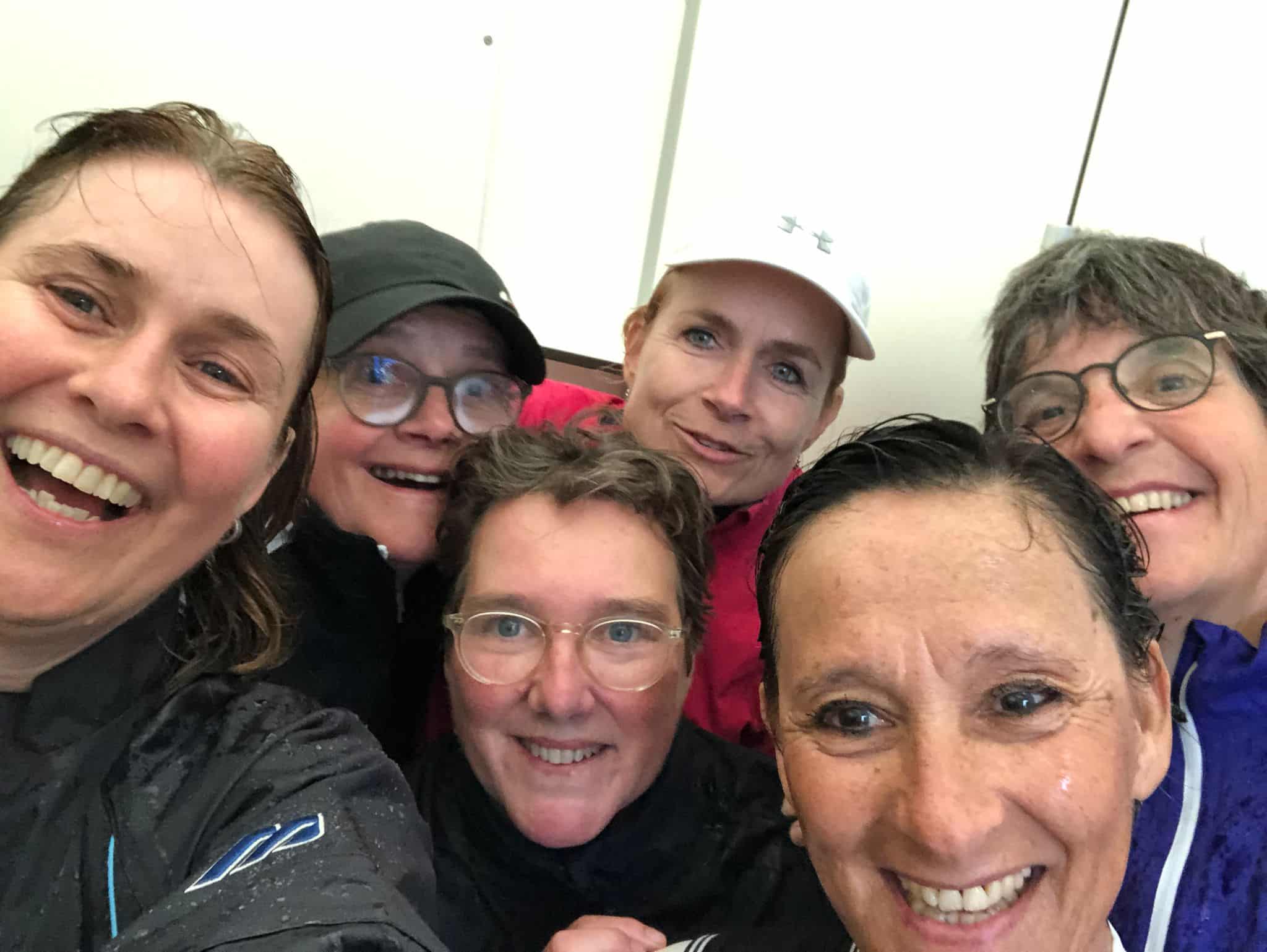 In de middag was er regen en mogelijk onweer verwacht. Gelukkig schoof het in de tijd steeds verder op dus ik hoopte nog op een droog einde. Na de eerste negen stond ik 1 up. Onze reserve Yvonne was inmiddels gearriveerd om ons aan te moedigen en wist te melden dat Francis al 4 of 5 up stond. De regenwolken trokken rond ons samen en de luchten begonnen steeds donkerder te worden. Het onweersgerommel begon, en dat kwam mijn spel niet ten goede. Mijn tegenstander probeerde me gerust te stellen door te zeggen dat het nog erg ver weg was. En plotseling was daar ineens een grote flits met een ontzettende donderslag vlak bij ons op de 14e hole. Ik liet mijn kar staan en sprintte mijn snelste 200 meter aller tijden naar het toiletgebouw. Binnen enkele minuten kwamen ook Vera en Helga met flightgenoten daar aan, en even later ook Yolanda. Het water kwam met bakken uit de hemel en het onweer ging maar door. Na bekomen te zijn van de eerste schrik, begon Vera de onderhandelingen om de wedstrijd te ‘halven’. Voor ons voldoende voor het kampioenschap. We wisten dat Francis al had gewonnen, wij stonden allemaal up…maar ja waar was Liesbeth en hoe stond zij er voor? Zeewolde was hier echter niet voor te porren en na circa 20 minuten met 8 dames opgesloten te hebben gezeten in een heel klein wc gebouwtje moesten we terug naar het clubhuis. In de hoop na een uur de wedstrijd te kunnen hervatten.
